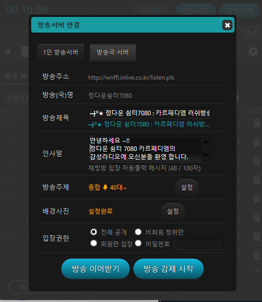 위에 사진은 방송국 설정 사진 저사진처럼 설정후 방송 이어받기 눌러 놓으면