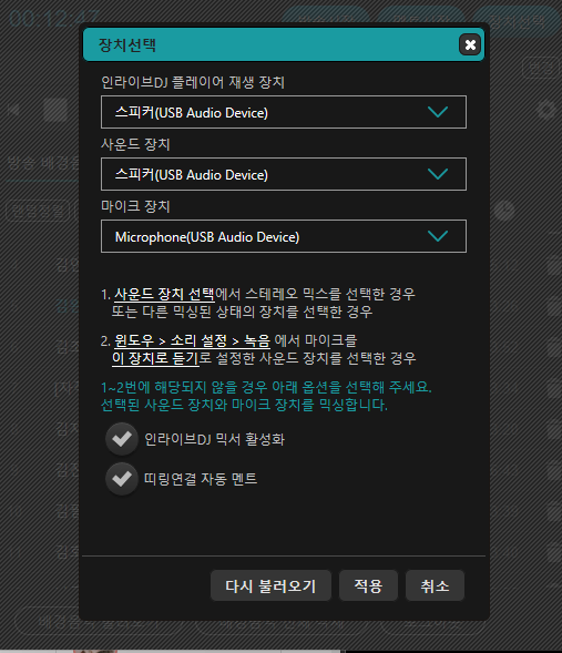 인라이브dj 믹서 활성화 체크 해주시고요